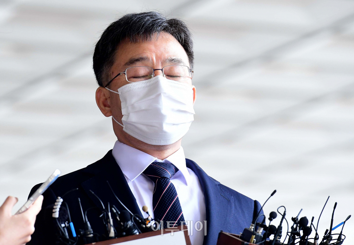 대장동 개발 로비·특혜 의혹의 핵심 인물인 화천대유자산관리(화천대유) 대주주 김만배 씨가 11일 서울 서초구 서울중앙지검에 피의자 신분으로 출석하고 있다.