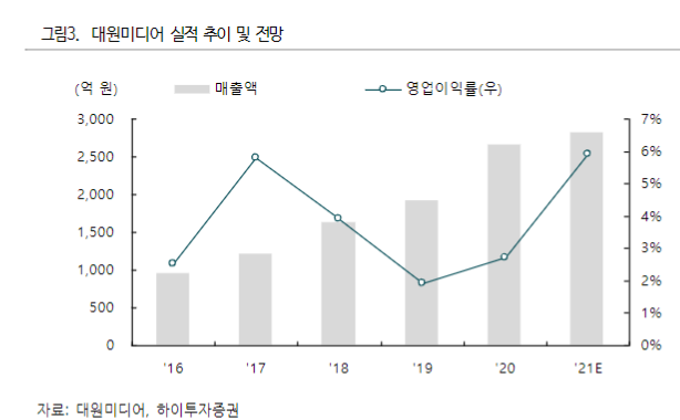 하이투자증권은 12일 대원미디어에 대해 "자체 콘텐츠 IP 밸류 상승이 가시화했다"고 평가했다. 투자의견과 목표주가는 제시하지 않았다.