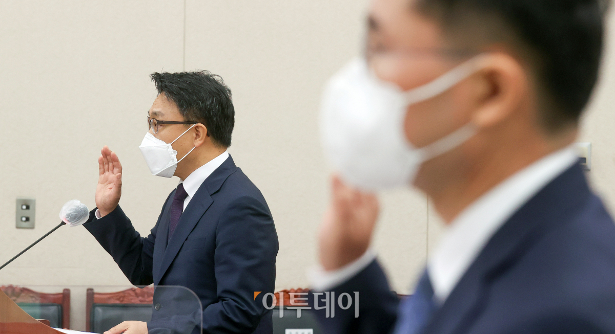 김진욱 공수처장이 12일 오후 서울 여의도 국회에서 열린 법제사법위원회의 고위공직자범죄수사처에 대한 국정감사에서 증인 선서를 하고 있다.