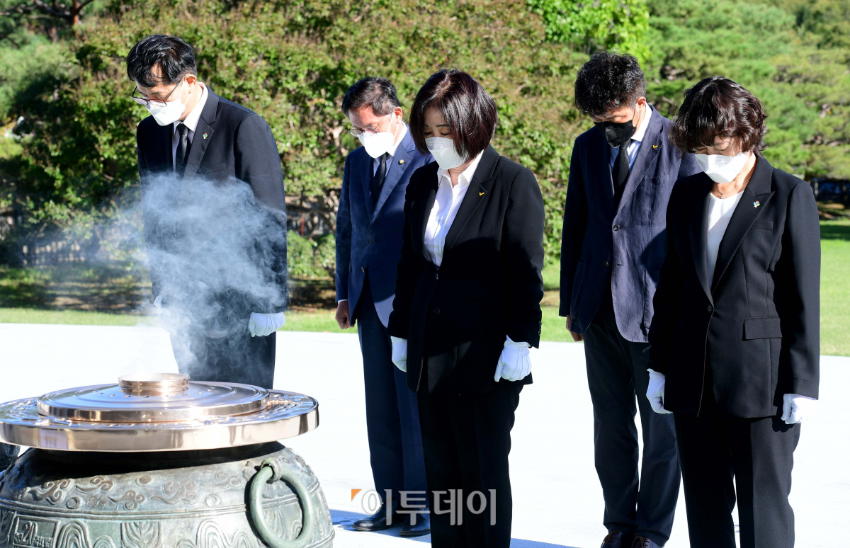심상정 정의당 대선후보와 지도부가 13일 서울 동작구 국립서울현충원을 찾아 참배하고 있다.