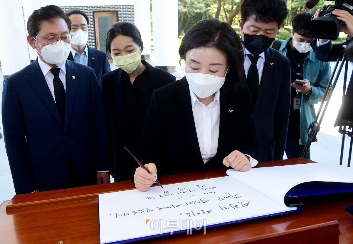심상정 정의당 대선후보가 13일 서울 동작구 국립서울현충원을 찾아 참배한 뒤 방명록을 작성하고 있다.
