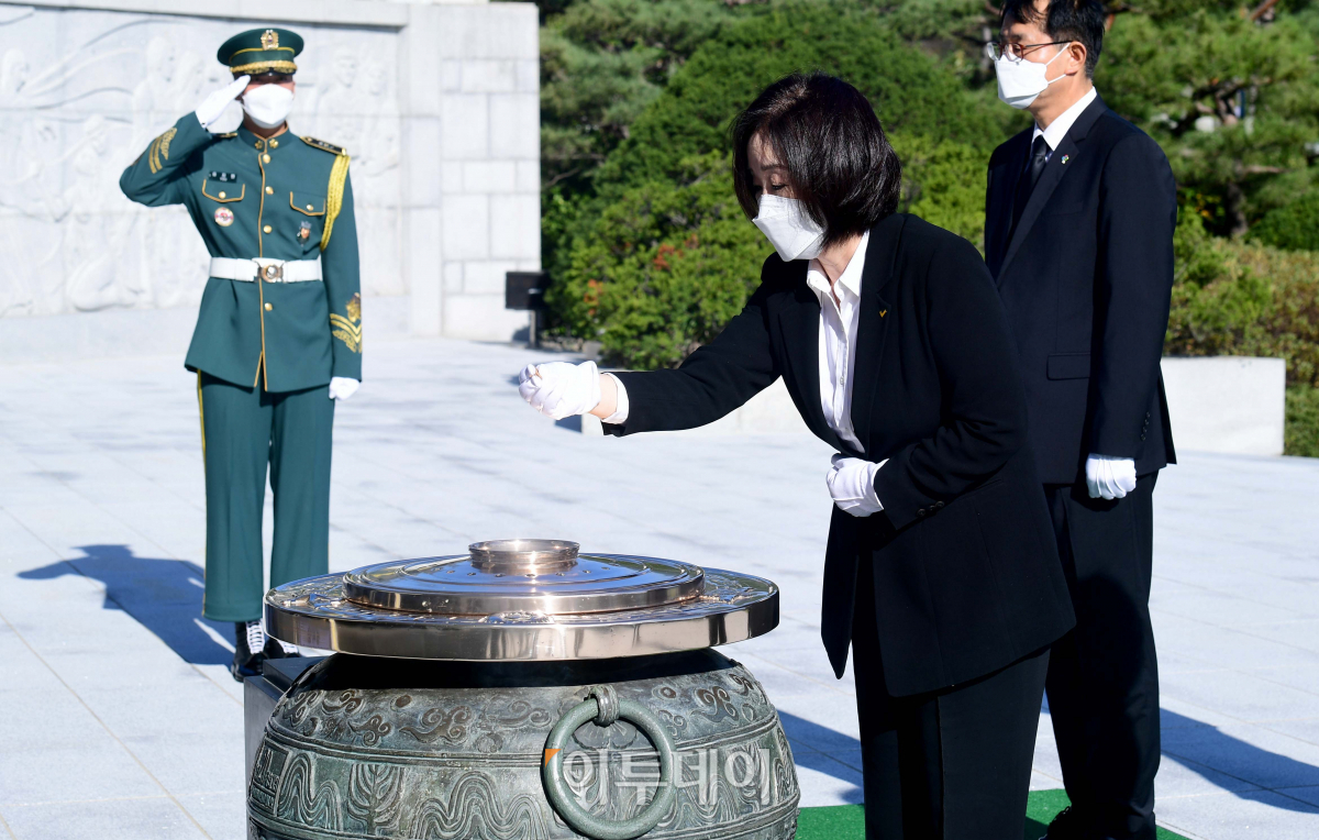 심상정 정의당 대선후보가 13일 서울 동작구 국립서울현충원을 찾아 참배하고 있다.