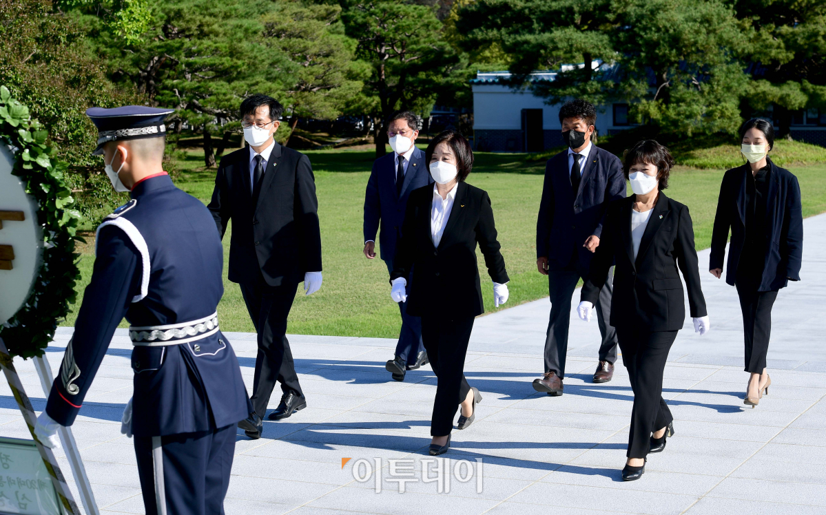 심상정 정의당 대선후보와 지도부가 13일 서울 동작구 국립서울현충원을 찾아 참배하고 있다.