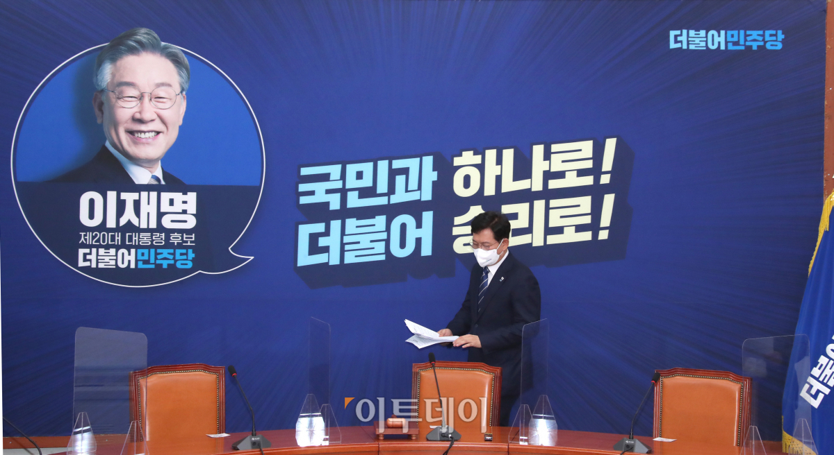 송영길 더불어민주당 대표가 13일 국회에서 열린 최고위원회의에 참석하고 있다.