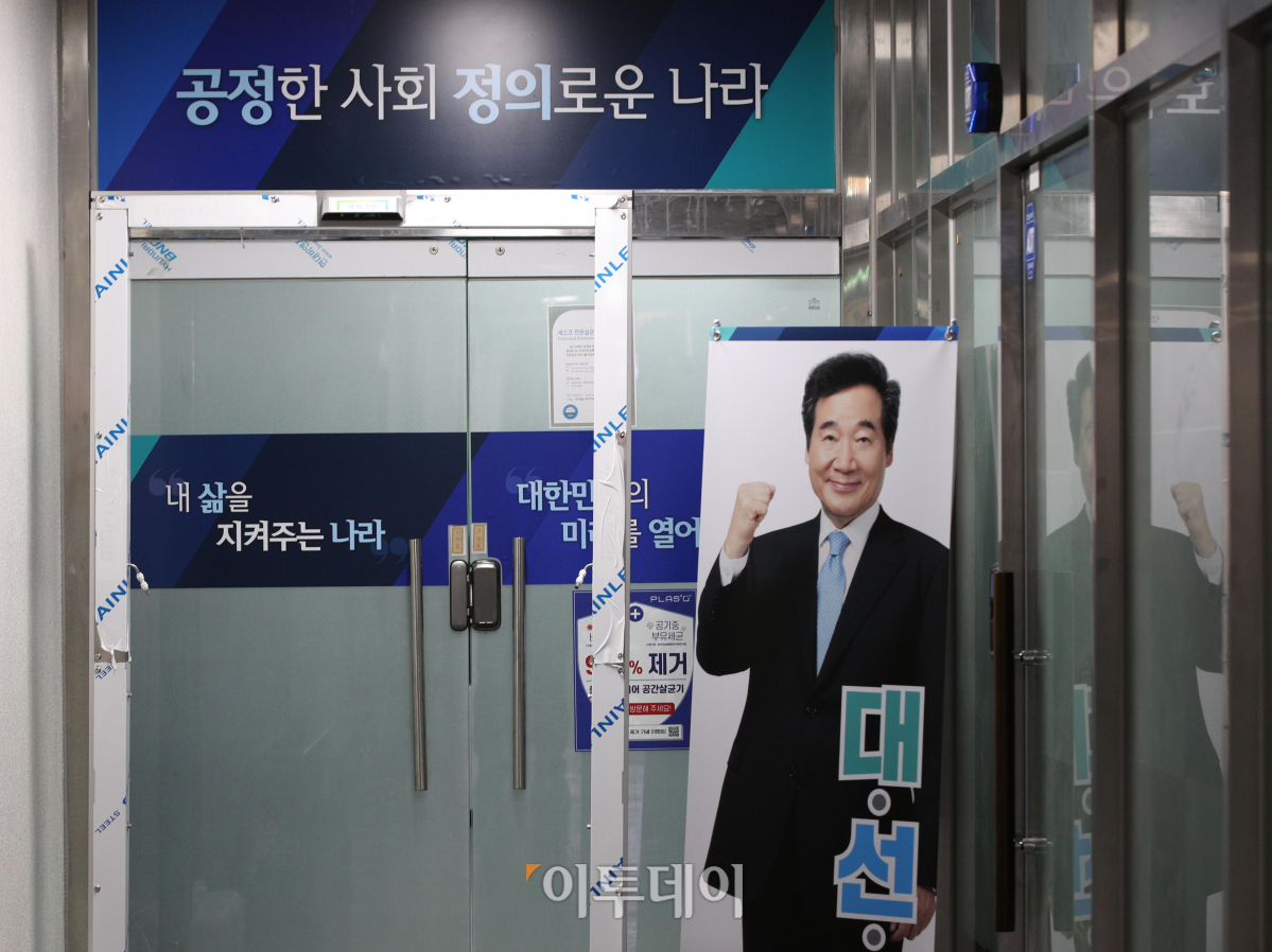 13일 오전 서울 여의도 국회 앞 이낙연 전 더불어민주당 대표의 선거 캠프 회의실 출입문을 잠근 채 실무진들이 회의하고 있다.