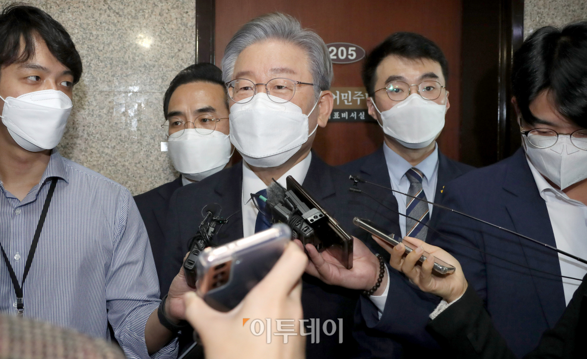 더불어민주당 대선후보인 이재명 경기도지사가 13일 서울 여의도 국회에서 열린 대선후보-당대표-상임고문단 간담회에 참석한 뒤 당 대표실을 나서며 기자들의 질문에 답하고 있다.