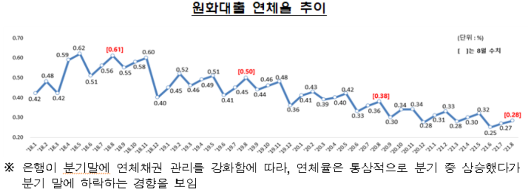 금감원 관계자는 "은행이 분기말에 연체채권 관리를 강화함에 따라, 연체율은 통상적으로 분기 중 상승했다가 분기 말에 하락하는 경향을 보인다"고 설명했다.