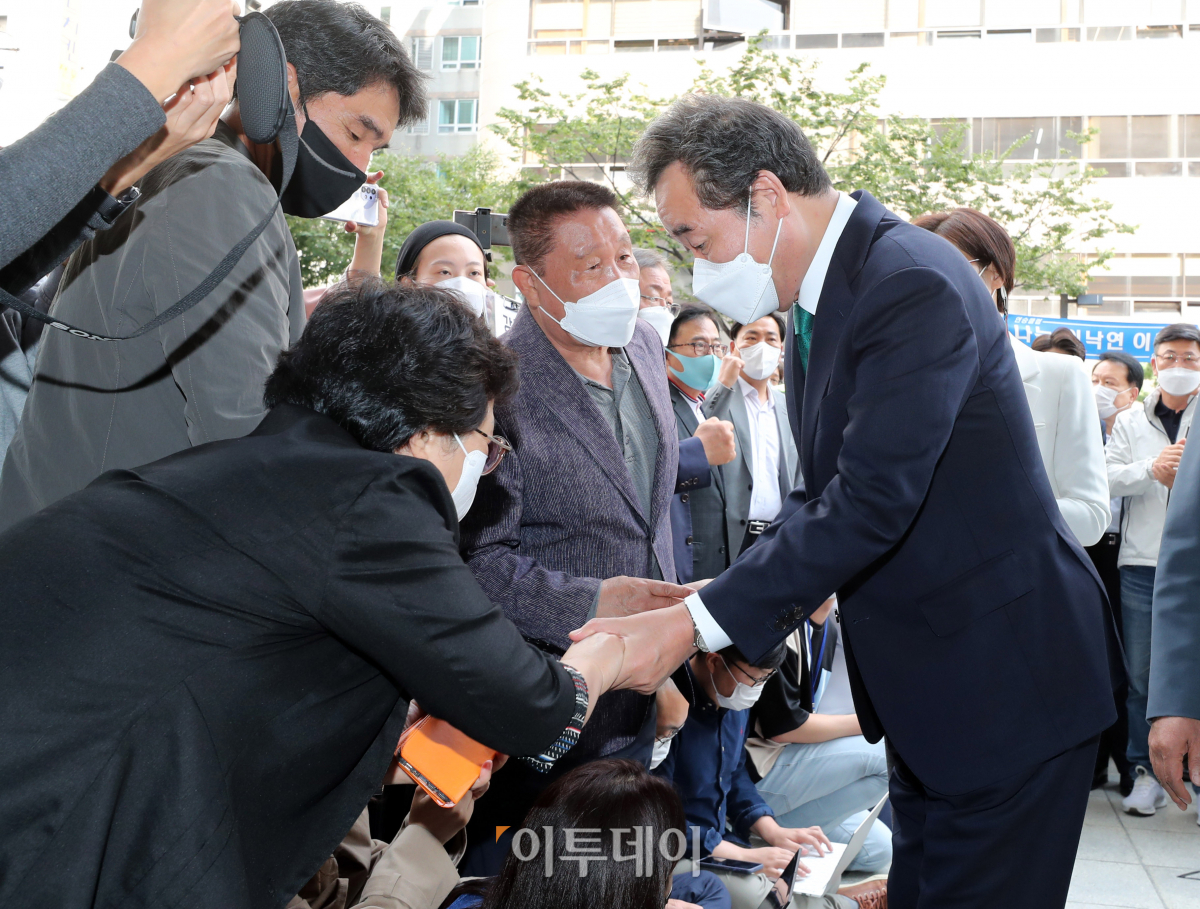 이낙연 전 더불어민주당 대표가 14일 오후 서울 여의도 대산빌딩에서 열린 필연캠프 해단식에 참석하며 지지자들과 인사를 나누고 있다.