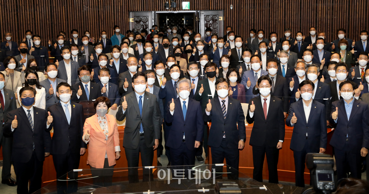 더불어민주당 송영길 대표와 윤호중 원내대표를 비롯한 참석 의원들이 15일 오전 서울 여의도 국회 예결위회의장에서 열린 의원총회에서 이재명 대선 후보와 기념사진을 찍고 있다.