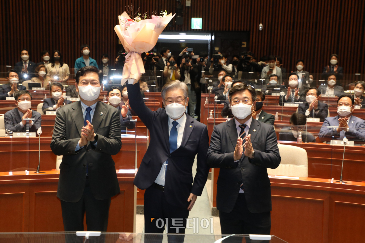 15일 오전 서울 국회에서 열린 더불어민주당 의원총회에 참석한 이재명 대선 후보가 윤호중 원내대표가 준 꽃다발을 들어보이며 대선승리를 다짐 하고 있다. 신태현 기자 holjjak@