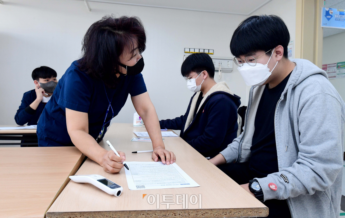 12~17세 소아청소년에 대한 코로나19 백신 접종이 시작된 18일 서울 양천구 홍익병원에서 학생들이 코로나19 백신접종을 위해 예진표를 작성하고 있다. 이날부터 16∼17세 청소년(2004∼2005년생)과 임신부의 백신 접종이 시작된다. 이외에도 12∼15세(2006∼2009년) 청소년에 대한 백신 접종 사전 예약이 이날 오후 8시부터 시작된다. 예약은 내달 12일까지 계속되며 접종은 내달 1일부터 27일까지다.