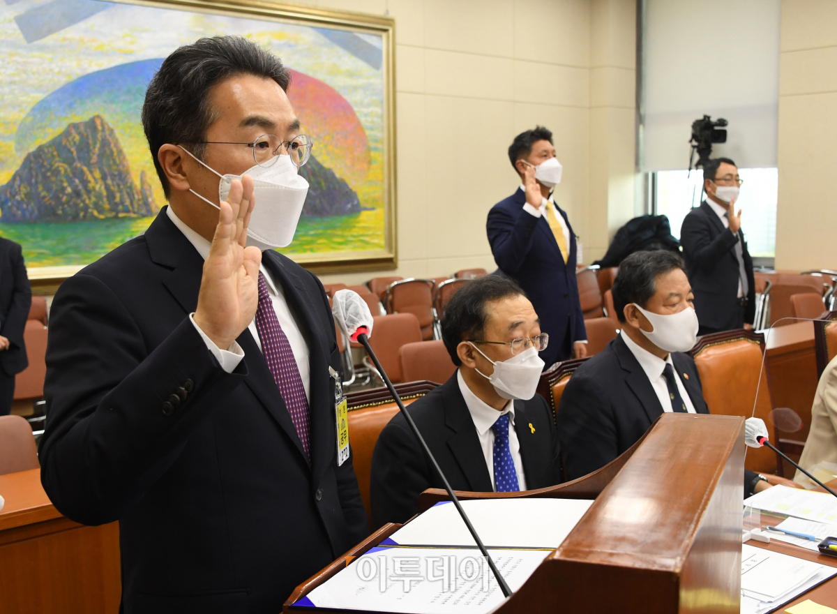 20일 국회에서 열린 정무위원회 국정감사에서 증인으로 출석한 강한승 쿠팡 대표이사(왼쪽부터) 박강수 골프존 대표이사, 유영상 SK텔레콤 MNO사업대표가 선서하고 있다.