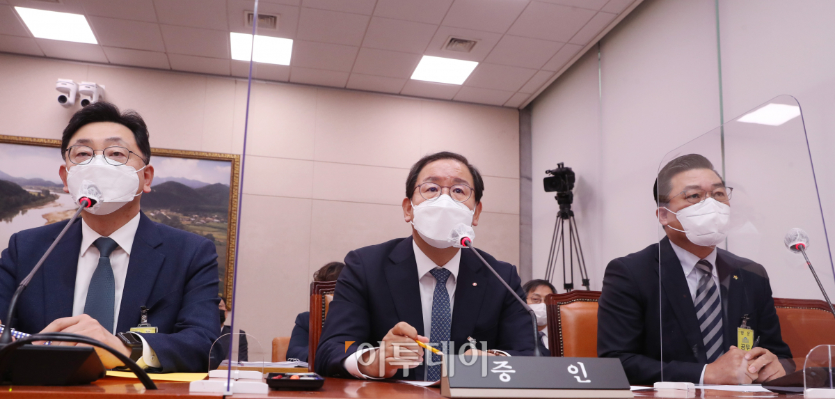 김낙현 오뚜기 상무(왼쪽부터), 황청용 농심 전무, 유상준 아워홈 구매본부장이 20일 서울 여의도 국회에서 열린 농림축산식품해양수산위원회의 농림축산식품부 및 소관기관 종합감사에 일반증인으로 출석해 답변하고 있다.