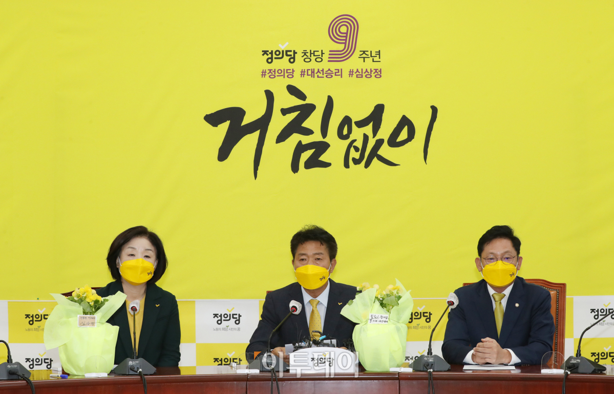 21일 서울 여의도 국회에서 열린 정의당 창당 9주년 기념식에서 여영국 대표가 인사말을 하고 있다.