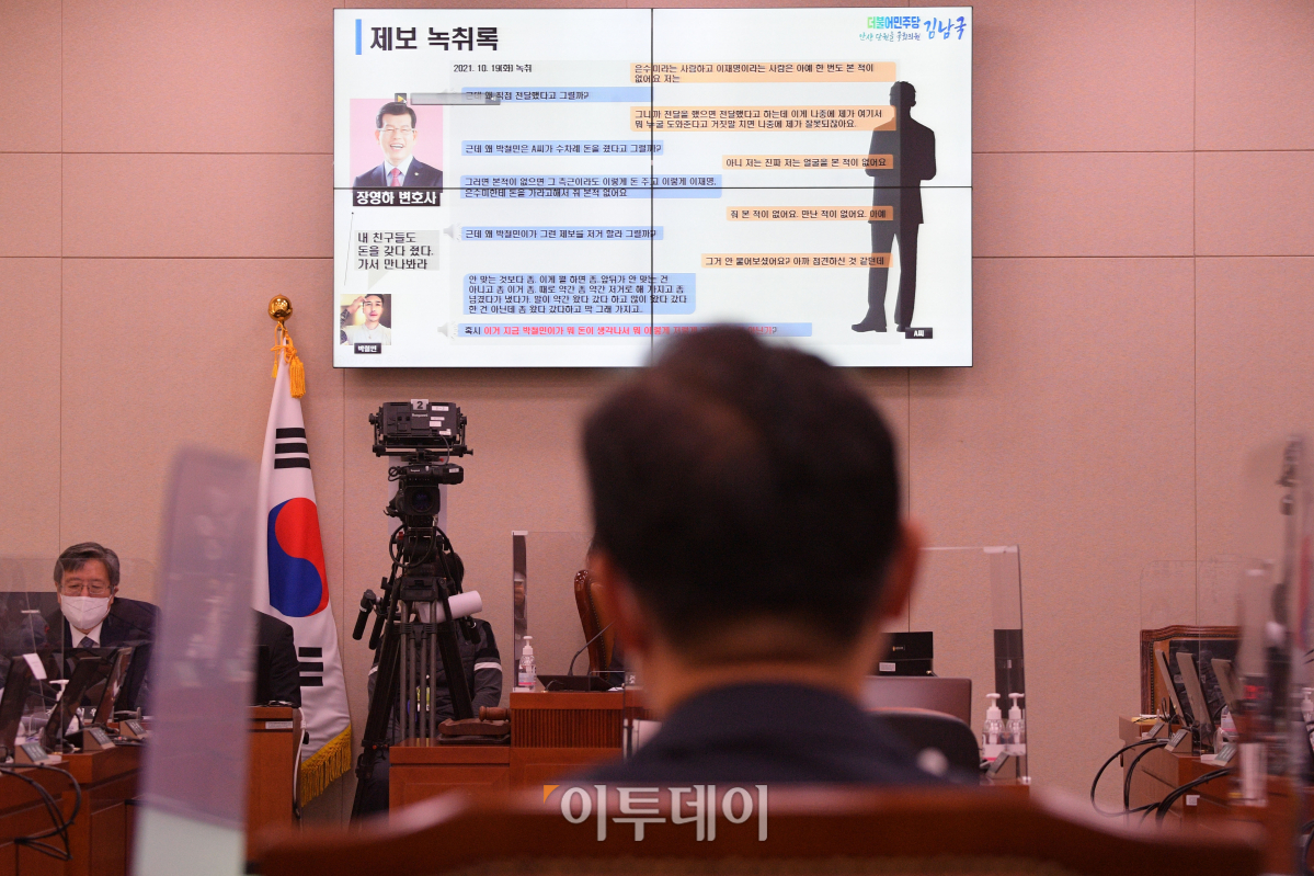 김남국 더불어민주당 의원이 21일 오전 서울 여의도 국회에서 열린 법제사법위원회의 법무부, 대법원 등에 대한 종합감사에서 이재명 경기도지사에게 금품을 전했다는 박철민 씨 주장을 반박하는 제보 녹취록을 공개하고 있다.