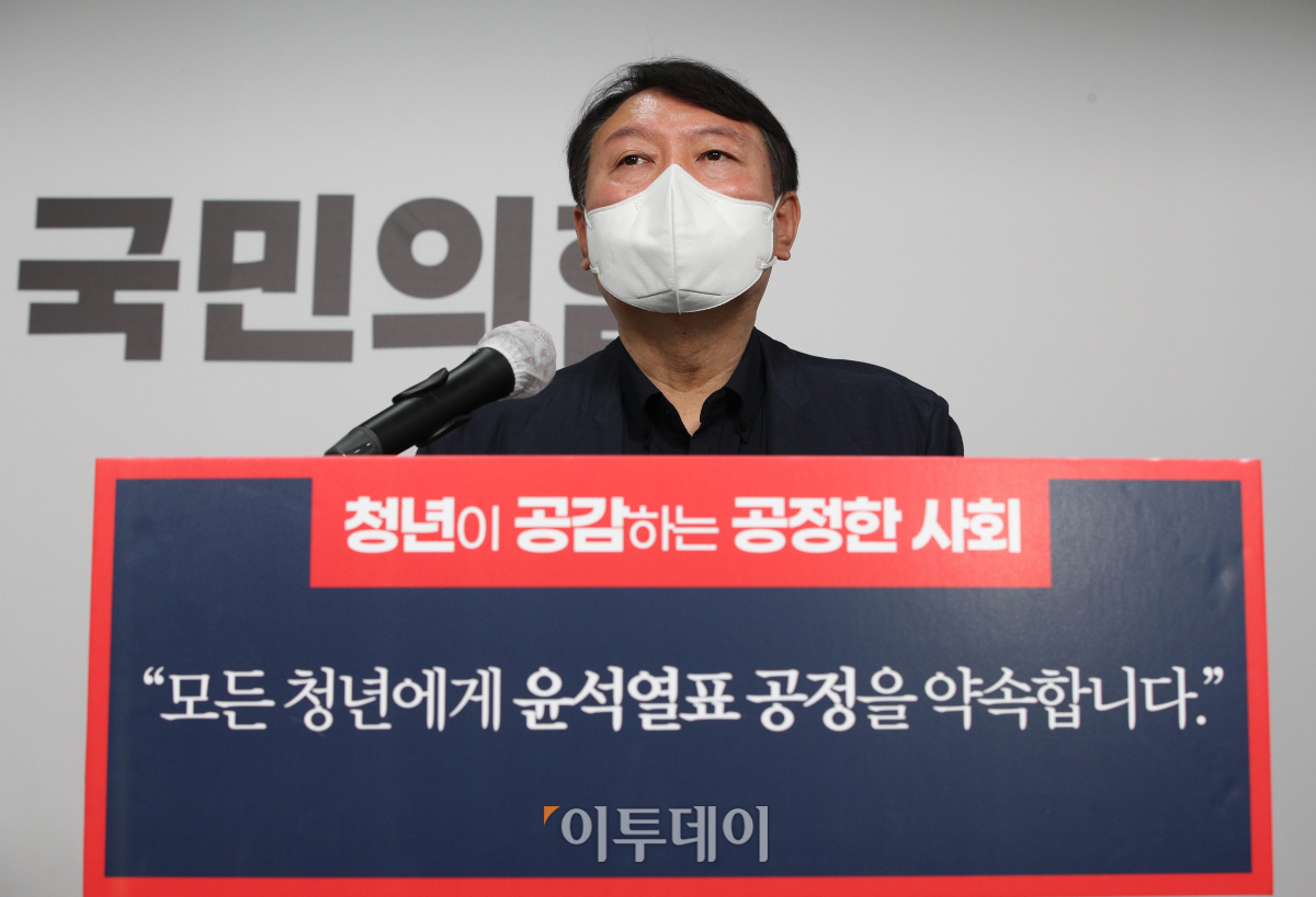 윤석열 국민의힘 대선 경선 후보가 21일 오전 서울 여의도 국민의힘 중앙당사에서 청년정책 공약을 발표하고 있다. 이 자리에서 윤 후보는 “전두환 옹호 발언과 관련 비판을 겸허히 수용하고 유감을 표한다”고 밝혔다.