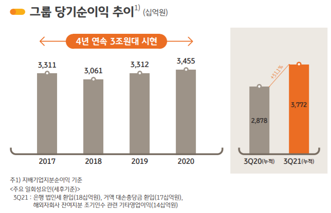 3분기 누적기준 당기순이익은 3조 7722억 원으로 전년동기(2조 8779억 원) 대비 31.1%(8943억 원) 증가했다. 사업 부문별 핵심 비즈니스 강화를 통한 수익창출 기반 확대 및 M&A를 통한 비즈니스 포트폴리오 다각화 노력 등의 영향이라고 KB금융은 설명했다.