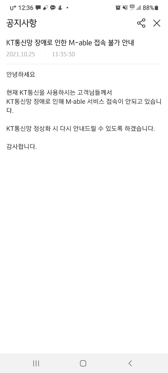 KB증권은 공지를 통해 “현재 KT통신을 사용하시는 고객님들께서 KT통신망 장애로 인해 M-able 서비스 접속이 안되고 있다”며 “KT통신망 정상화 시 다시 안내드릴 수 있도록 하겠다”고 공지했다.