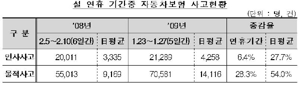 금감원은 지난 설 연휴기간(23~27일) 동안 14개 손보사에 접수된 자동차보험 사고 현황을 집계한 결과,인사사고 피해자는 2만1289명으로 2008년 2만11명 보다 6.4% 증가했으며 물적사고는 7만581건으로 5만5013건 보다 28.3% 늘어난 것으로 파악됐다고 4일 밝혔다.