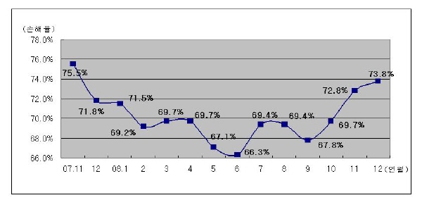 금감원 관계는 "지난 2007년 11월 이후 하락했던 손해율이 2008년 7월부터 악화되기 시작해 12월에는 73.8%까지 상승했으며 올 1월에는 설날 연휴중 사고 증가 등으로 손해율 악화추세가 지속될 전망"이라고 말했다.