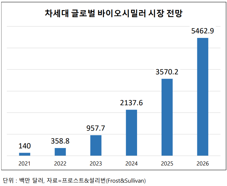 글로벌 시장조사기관 프로스트&설리번에 따르면 세포·유전자치료제, 재조합단백질 제제 등 3세대 바이오의약품에 대한 관심이 커지면서 올해 1억4000만 달러(약 1637억 원) 규모인 전 세계바이오시밀러 시장은 2026년 54억6290만 달러(약 6조3926억 원)로 폭발적인 성장이 전망된다.