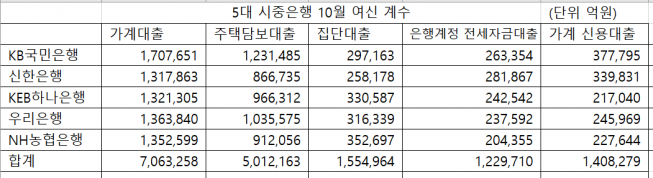 1일 5대 시중은행(KB국민·신한·하나·우리·NH농협은행)이 발표한 10월 여신 계수자료에 따르면 지난달 말 가계대출 잔액은 706조3258억 원으로 전월 기록한 702조8877억 원보다 3조4381억 원 증가했다.