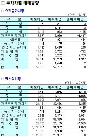 5일 코스피에서 기관은 772억원의 순매도를 보인 반면, 코스닥에서는 120억원의 순매수를 나타냈다.