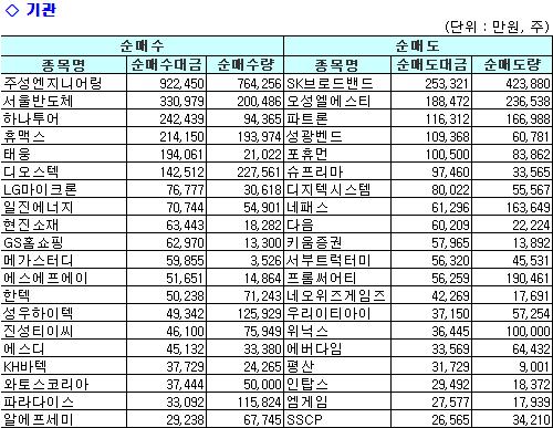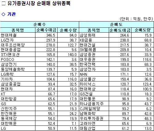 기관은 코스피시장에서 LG전자는 전일에 이어 순매수를 이어갔지만 삼성전자와 하이닉스는 순매도로 돌아섰다. BDI지수가 12일 연속 상승하자 STX팬오션과 한진해운, 대한해운 등에 대해서 매수에 나섰다.