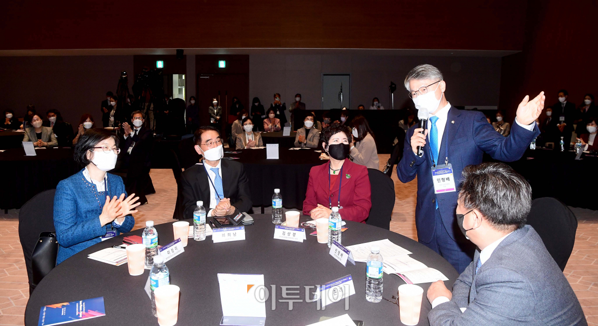 민형배 국회 정무위원회 위원이 3일 서울 여의도 한국거래소 콘퍼런스홀에서 열린 '2021 대한민국 여성 금융인 국제콘퍼런스'에서 축사를 하고 있다. 이투데이가 여성금융인네트워크와 공동 주최한 이번 행사는 '지속가능한 성장을 이끄는 새로운 물결 -ESG 투자 책임과 이사회 다양성-'을 주제로, 내년 8월 자본시장법 개정의 시행을 앞두고 금융계 고위직의 다양성 확보 방안을 모색하기 위한 공론의 장이다.
