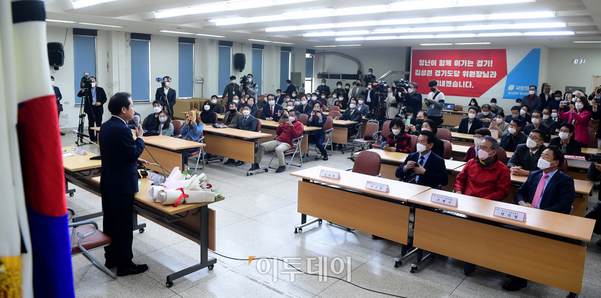 홍준표 국민의힘 대선경선후보가 4일 경기 수원시 국민의힘 경기도당위원회에서 지지자들과 간담회를 갖고 인사말을 하고 있다.