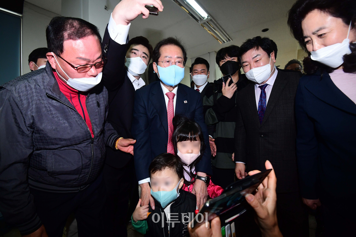 홍준표 국민의힘 대선경선후보가 4일 경기 수원시 국민의힘 경기도당위원회를 찾아 지지자들과 기념촬영을 하고 있다.