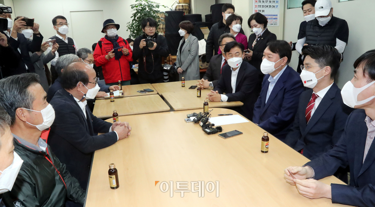 윤석열 국민의힘 대선경선후보가 4일 오전 경기 의정부 제일시장을 방문해 시장 상인들과 간담회를 갖고 있다. 국회사진취재단