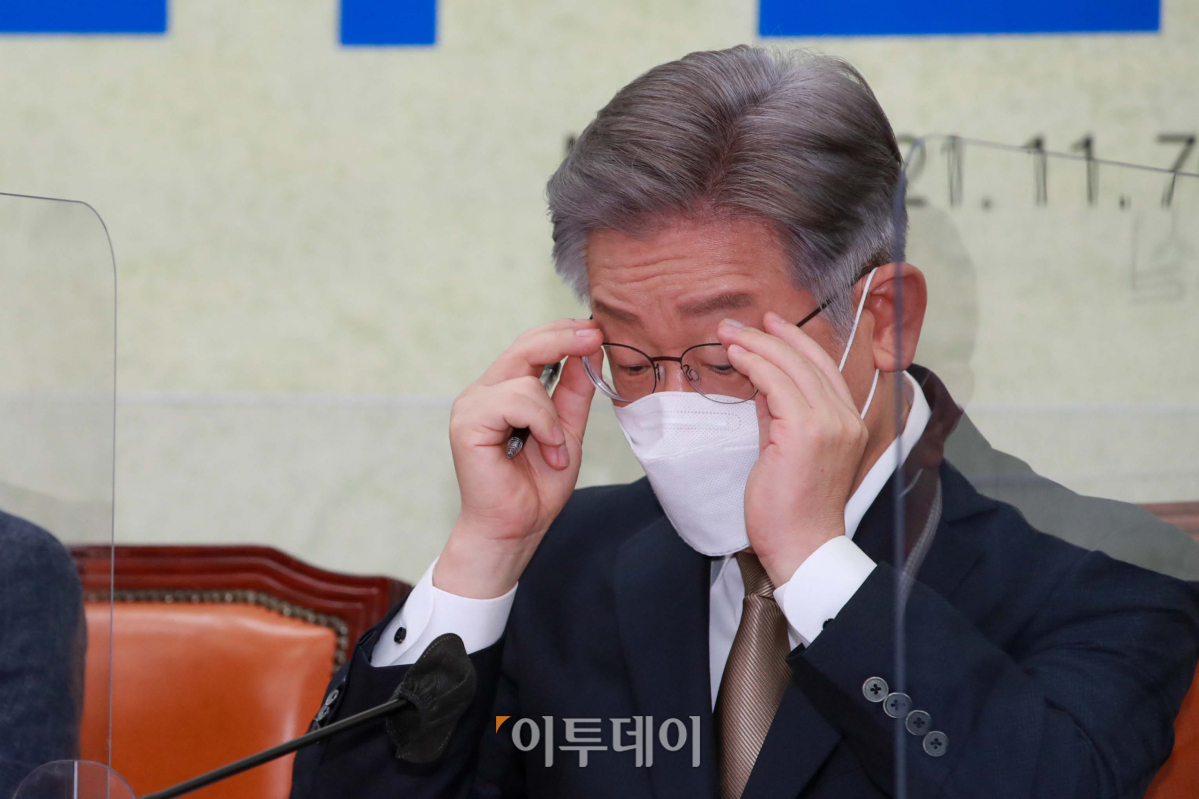 더불어민주당 이재명 대통령 선거 후보가 7일 서울 여의도 국회에서 열린 더불어민주당 요소수 관련 긴급회의에서 모두발언을 마친뒤 안경을 고쳐쓰고 있다.