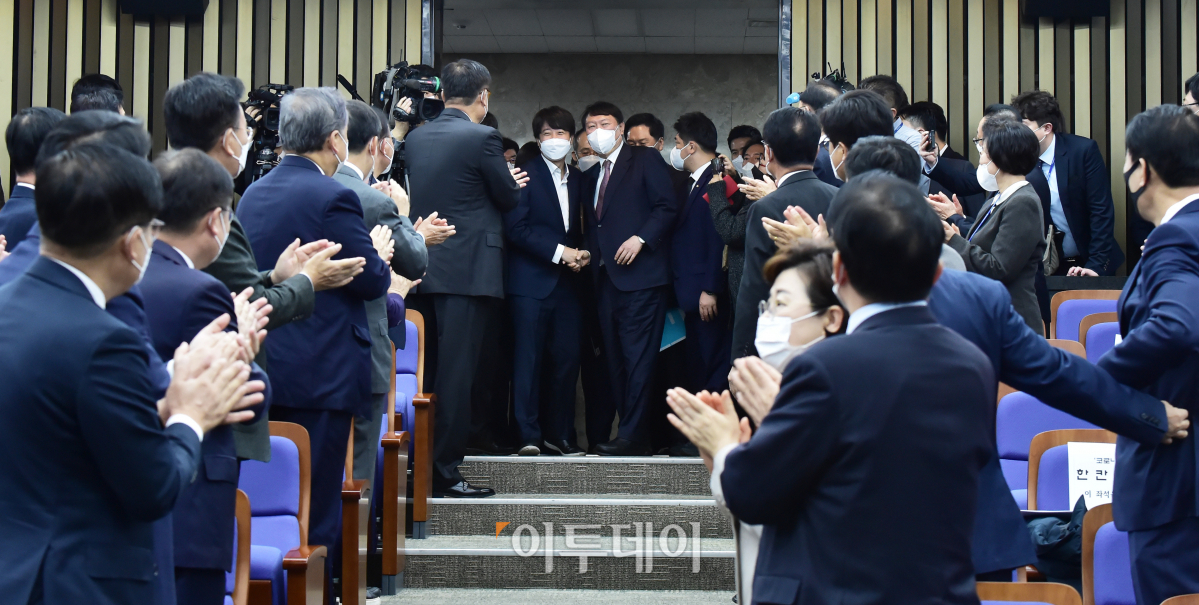 윤석열 국민의힘 대선후보, 이준석 대표가 8일 서울 여의도 국회 본관 246호에서 열린 국민의힘 현안 관련 보고에 의원들의 박수를 받으며 입장하고 있다.