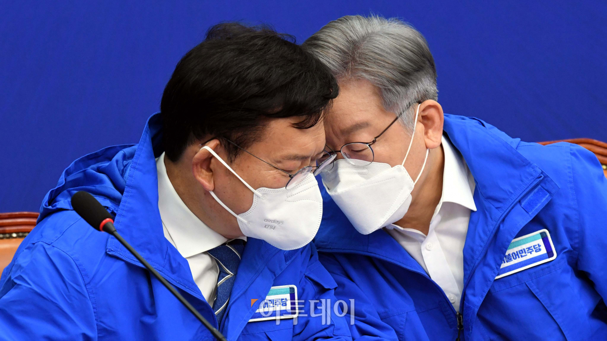 이재명 더불어민주당 대통령 후보와 송영길 대표가 8일 국회에서 열린 중앙 선거위원 대책 회의에 앞서 얘기를 나누고 있다.