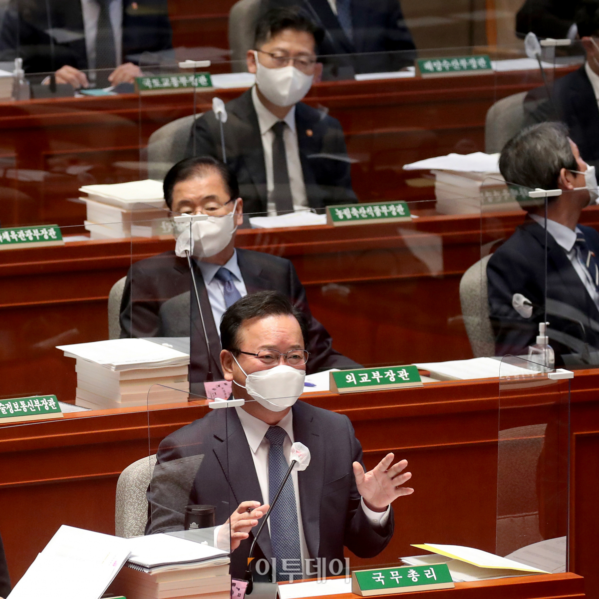 김부겸 국무총리가 8일 오전 서울 여의도 국회에서 열린 예산결산특별위원회 종합정책질의에서 의원들의 질의에 답하고 있다.