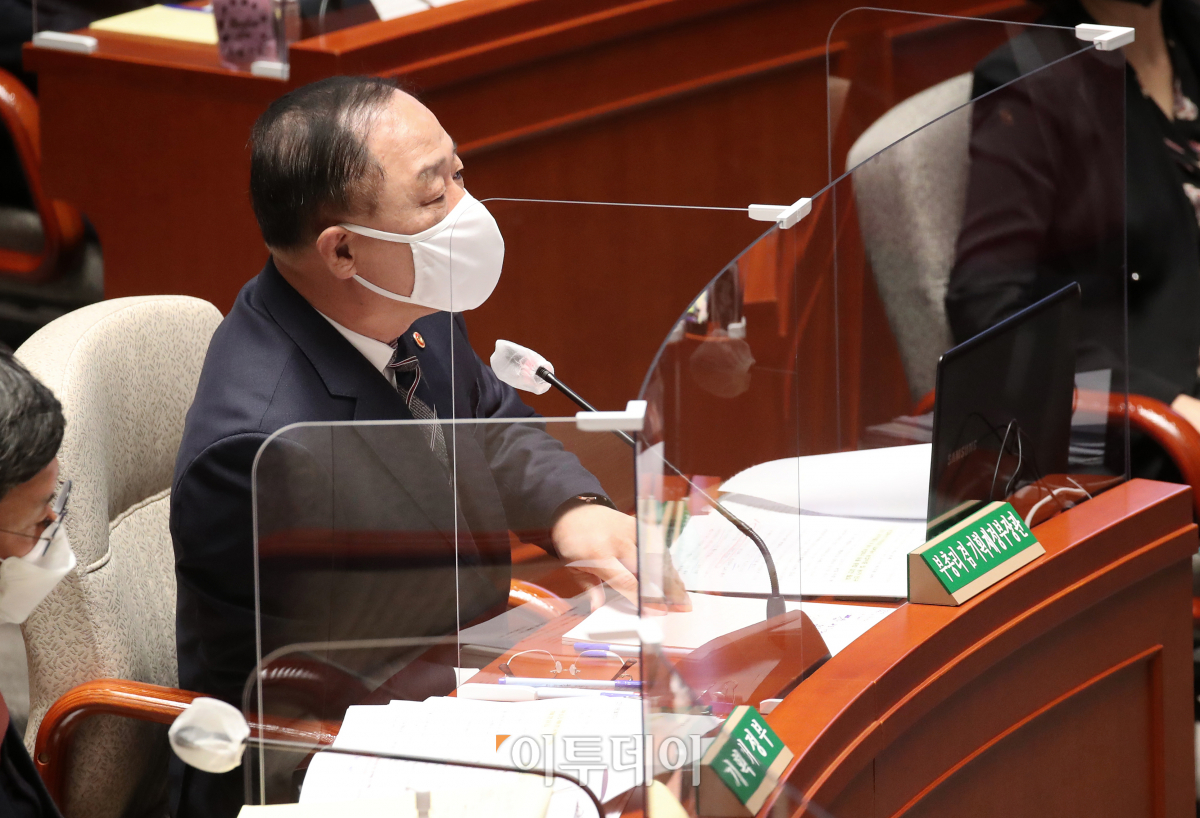 홍남기 경제부총리 겸 기획재정부 장관이 8일 오전 서울 여의도 국회에서 열린 예산결산특별위원회 종합정책질의에서 의원들의 질의에 답하고 있다.