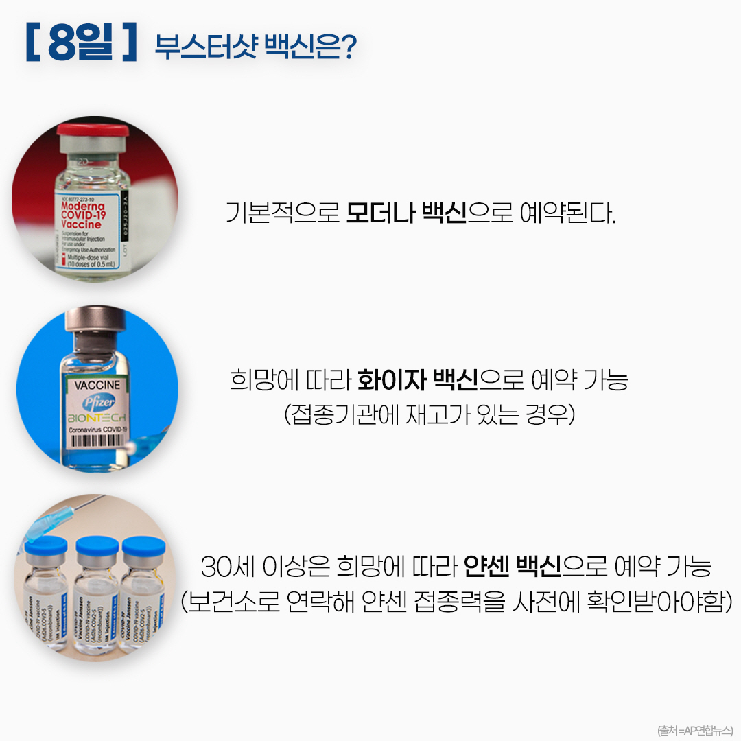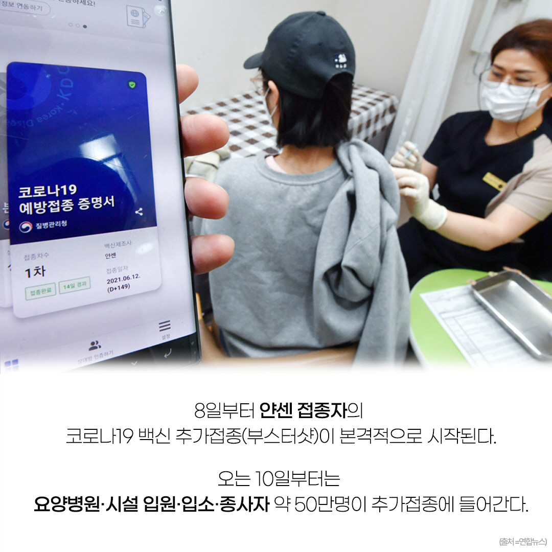 8일부터 얀센 접종자의 코로나19 백신 추가접종(부스터샷)이 본격적으로 시작됩니다. 이틀 뒤는 요양병원·시설 입원·입소·종사자 약 50만명도 추가접종에 들어갑니다.