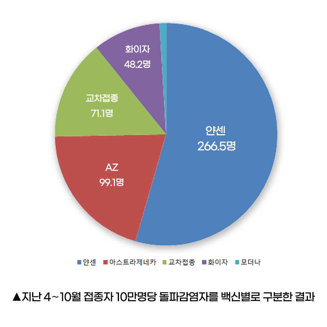 지난 4∼10월 접종자 10만명당 돌파감염자를 백신별로 구분한 결과 △얀센 266.5명 △아스트라제네카 99.1명 △교차접종71.1명 △화이자48.2명 △모더나4.6명으로 나타났습니다.
