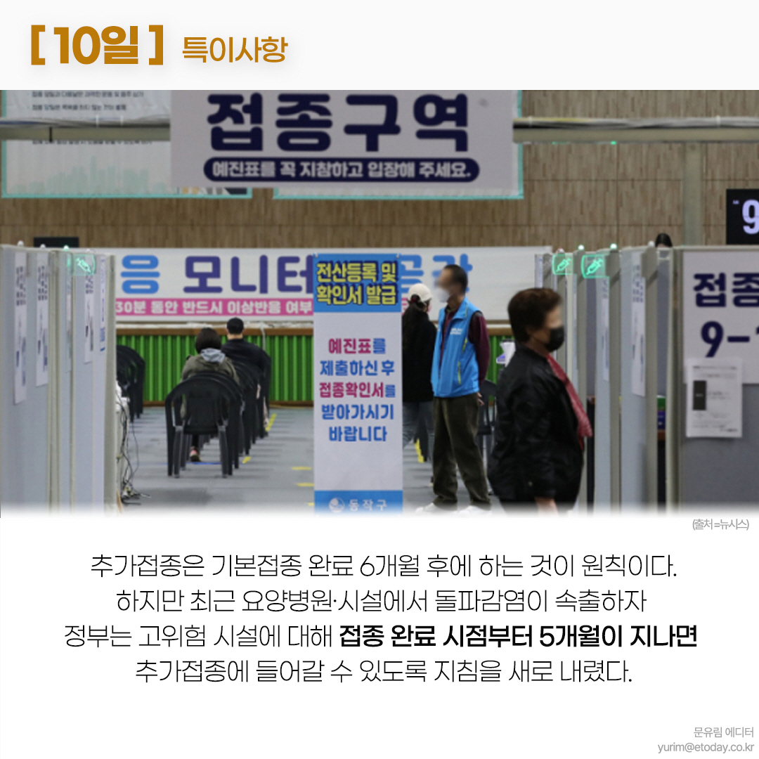 추가접종은 기본접종 완료 6개월 후에 하는 것이 원칙이지만, 최근 요양병원·시설에서 돌파감염이 속출하자 정부는 고위험 시설에 대해 접종 완료 시점부터 5개월이 지나면 추가접종에 들어갈 수 있도록 지침을 새로 내렸습니다.