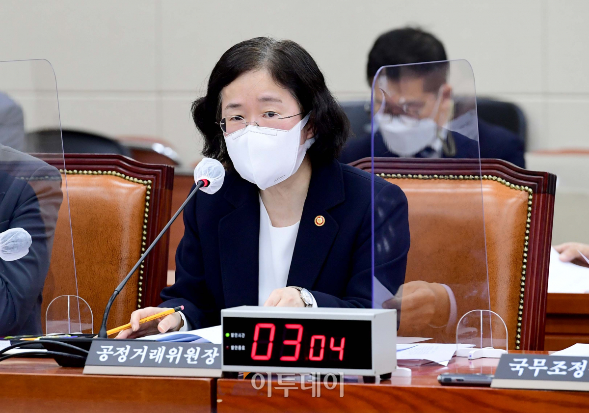 조성욱 공정거래위원장이 9일 서울 여의도 국회에서 열린 정무위원회 전체회의에서 의원 질의에 답하고 있다.