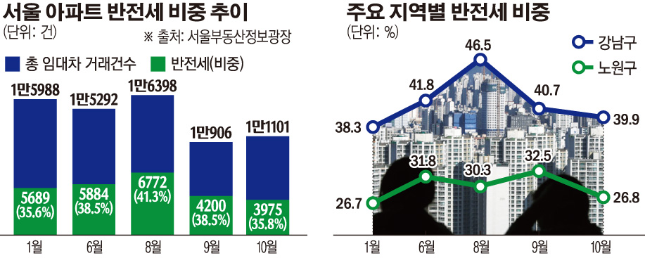 특히 고가전세가 몰린 강남구는 반전세 비중이 평균 40%에 달했다. 전셋값이 치솟자 반전세 비중이 급증한 것이다. 중저가 단지가 밀집한 노원구 역시 반전세 비중이 많이 늘었다. 노원구 반전세 비율은 1월 26%에 불과했지만, 하반기에는 30% 선을 웃돌았다. 특히 9월에는 32.5%까지 치솟았다.