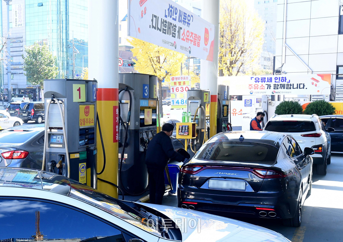 유류세가 한시적으로 인하된 12일 서울의 한 알뜰주유소에서 시민들이 기름을 넣고 있다. 정부는 이날부터 휘발유와 경유, 액화석유가스(LPG) 부탄에 대한 유류세를 20% 인하하기로 했다. 이에 따라 휘발유는 최대 리터당 164원, 경유 116원, LPG부탄 40원의 인하 효과가 예상된다. 이는 약 6개월가량 한시적으로 적용될 예정이다. 유류세 인하에 따른 휘발유 소비자 가격이 곧바로 인하되는 주유소는 일부로, 정유사가 직영으로 운영하는 주유소와 알뜰주유소 등이다.