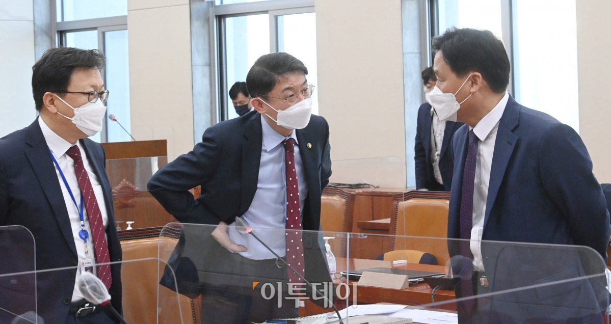 국회 기획재정위원회 조세소위 김영진(오른쪽) 소위원장이 15일 오전 국회에서 열린 기재위 조세소위 회의에 앞서 안도걸 기획재정부 제2차관과 이야기를 나누고 있다.