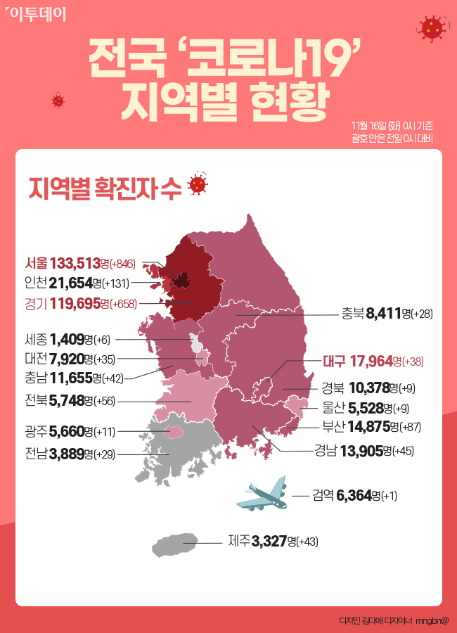 [코로나19 현황] 국내 확진자 '총 39만9591명' 2125명 추가…사망자 22명 늘어- 11월 15일 0시
