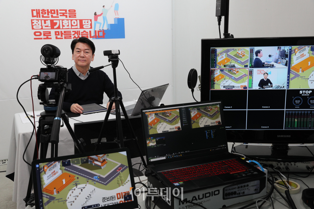 안철수 국민의당 대통령 후보가 16일 오후 서울 여의도 당사에서 메타버스(현실 세계와 같은 활동이 이뤄지는 3차원 가상세계)의 기자회견장에서 청년과 관련 ‘대한민국을 청년 기회의 땅으로 만들겠습니다’란 주제로 2호 첫 번째 공약을 발표하며 가상공간에 입장한 기자들과 일문일답하고 있다.