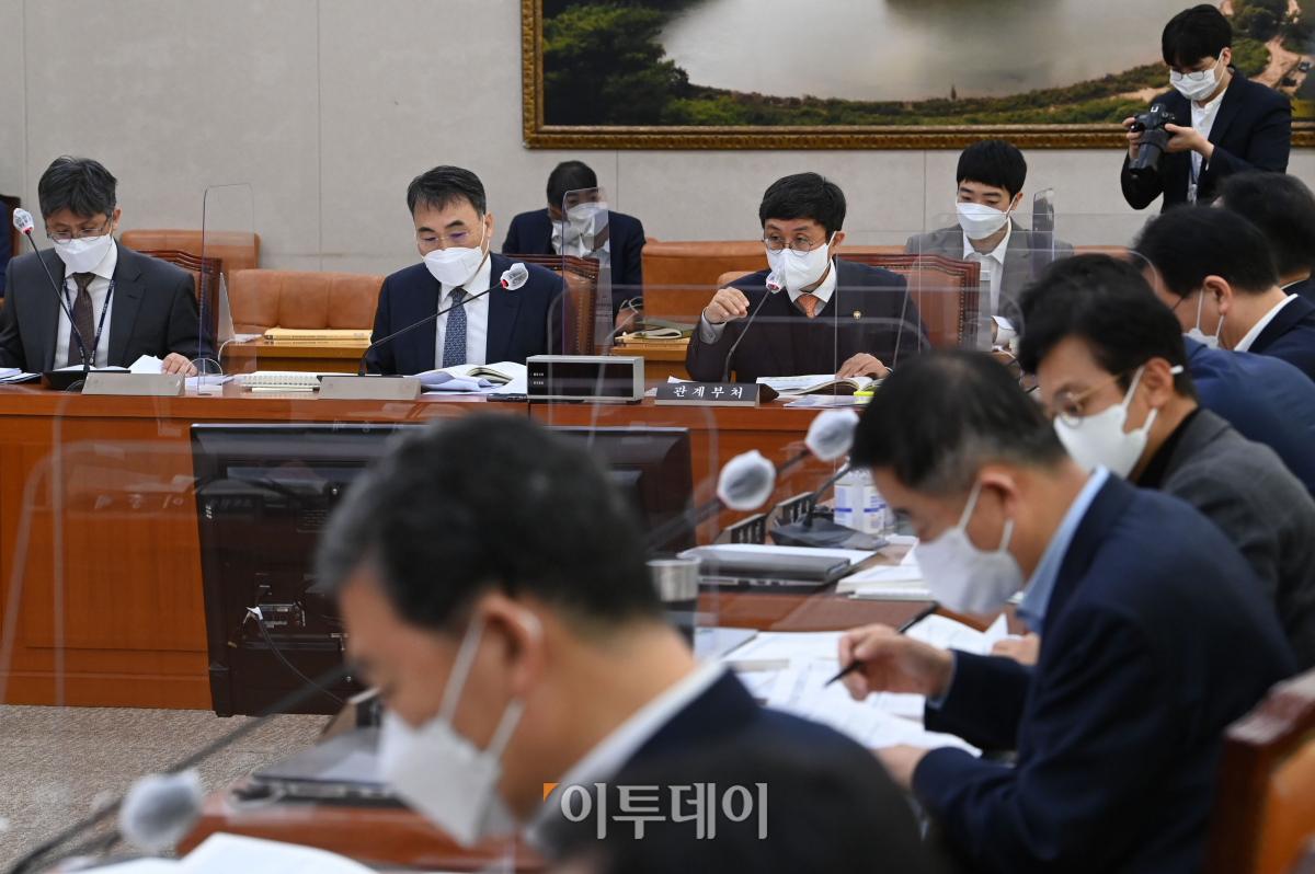 안도걸 기획재정부 2차관이 17일 서울 여의도 국회에서 열린 예결위 2022년 예산안등조정소위에서 의원들의 질의에 답하고 있다. 신태현 기자 holjjak@