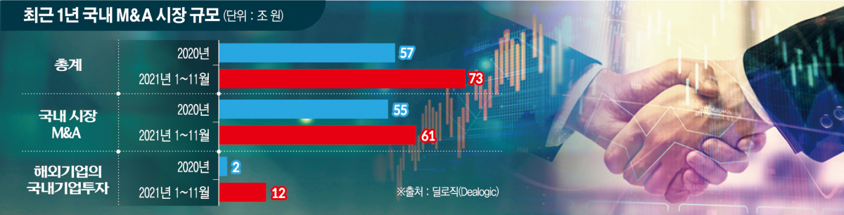 올해 초부터 현재까지 집계된 국내 M&A 시장 규모 지난해 전체 규모 대비 27%가량 증가했다. 코로나19 사태 장기화로 내수경기가 위축됐지만 시장 규모는 오히려 커진 것이다.