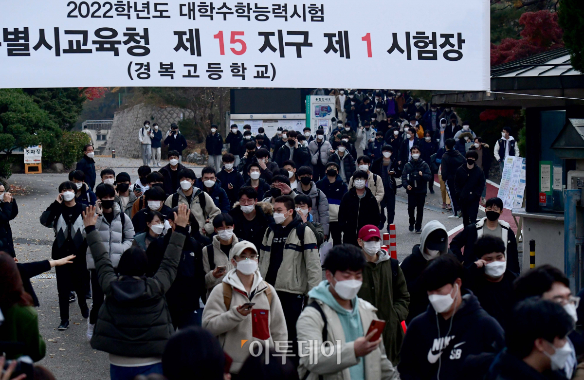 2022학년도 대학수학능력시험일인 18일 오후 서울 종로구 경복고에서 시험을 마친 수험생들이 교정을 나서고 있다.