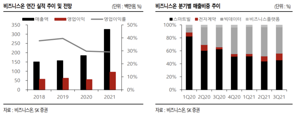 윤혁진 SK증권 연구원은 “올해 3분기 비즈니스온의 매출액 83억 원, 영업이익 25억 원으로 지난해 같은 기간보다 각각 94%, 83.1% 올랐다”라며 “성장세가 지속 중이다”라고 말했다.